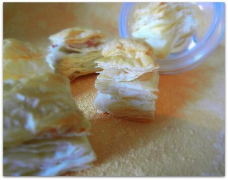 Беспроигрышная закуска к любому столу - вкусно, удобно, эстетично и быстро. Универсальная закуска, которая разлетается очень быстро, а главное что наполнение может быть любым, а значит вкусовых решений огромное множество, безграничный полёт для фантазии и каждый раз новая закуска. Я в данном случае использовала печёночный паштет и творожный сыр, ссылки на паштеты оставлю в конце статьи. - 1 пачка (500г.) готового бездрожжевого теста - 100-150г. паштета - 100-150г. сливочного (творожного) сыра Или любой другой наполнитель, по вкусу. Тесто вынуть из пачки, разморозить при комнатной температуре, разрезать на квадратики, положить на пекарскую бумагу и выпекать до готовности. Я выпекала при 180С около 20-и минут. Вынуть из духовки, охладить. Затем, при помощи острого ножа, разделить каждую слойку вдоль на две или более частей. Не приминать! Промазать начинкой и соединить.