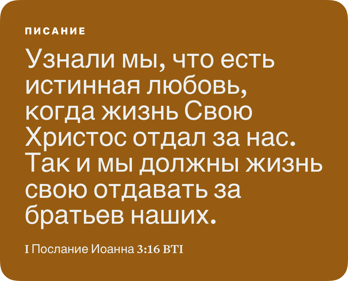 Иисус, всемогущий и совершенный, отдал Свою жизнь за нас. Он добровольно пошел на крест, чтобы быть распятым, на самую мучительную смерть, какую только можно себе представить, потому что Он так сильно любил нас. Он призывает нас делать то же самое. 1 Иоанна 3:16 НРП говорит нам: "Любовь мы узнали в том, что Иисус отдал за нас Свою жизнь. И мы тоже должны быть готовы отдать жизнь за братьев." Как мы можем проявлять такую жертвенную любовь в своей жизни? Можем ли мы посвятить свое время, внимание или ресурсы помощи нуждающемуся? Готовы ли мы слушать и быть рядом с другими, даже когда это нелегко или неудобно? Готовы ли мы даже отдать свою жизнь, чтобы заботиться и защищать других? Такая любовь сложна. Она призывает нас выйти за рамки наших собственных нужд и увидеть нужды других. Она призывает нас быть самоотверженными, терпеливыми и добрыми. Хорошая новость в том, что Иисус не просит нас сделать для кого-то то, чего Он не хотел сделать в первую очередь для нас. Он знает, как эт