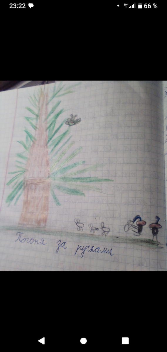 Уже рассвело. Ручки шли всё дальше и дальше в сторону корабля. Вдруг Маша вскрикнула: — Черт возьми! За нами гоняться "грибы"! Взрослые обернулись, и увидели позади себя стаю из 20 "грибов"... Обычно это довольно трусливые существа, но когда они собираются в такие огромные стаи, то дело плохо. И ручки побежали. Ляля запустила в них всего лишь 7 стрел, из них только 3 долетели до цели и убили "гриба". Михаил крикнул: —Бегите, я их задержу! И пошёл драться с ними. Вдруг Маша почувствовала тот самый укол "лианы". И ручки неожиданно выбежали на поляну, на которой росло гигантское дерево. Михаил так и не вернулся. Значит, он умер. Машка почувствовала себя плохо. Она понимала, что сейчас она сойдёт с ума. Но у неё возник план. — Раиса, папа, приготовьтесь! - крикнула она. "Грибы" подступали. Их было штук 15. Это очень много. Взрослые были ошарашены, ведь Маша собрала все свои силы и, схватив взрослых, прыгнула прямо на дерево. "Грибы" остались внизу. Дмитрий зацепился за ветку и под