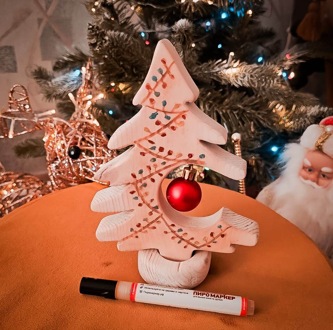 Подготовка: Начните с деревянной заготовки. Обязательно оставьте место для шарика посередине, чтобы он гармонично вписался в композицию. Заготовки можно вырезать самим или заказать готовые на маркетплейсах. Рисунок: С помощью простого карандаша аккуратно нанесите рисунок. Мы выбрали гирлянду, но вы можете использовать любую другую идею, которая вам нравится. Обводка: Обведите нарисованные линии пиромаркером на один раз. Там, где рисунок кажется вам бледнее, усильте нажим и обведите повторно. Термообработка: Нагрейте строительный фен на температуре 270-300 градусов и аккуратно пройдитесь по обведенным линиям. Будьте внимательны, чтобы не перегреть дерево. Чем дольше вы воздействуете на рисунок горячим воздухом, тем темнее он получится. Так вы можете варьировать тени и полутона. Раскраска: Используйте перламутровую гуашь для раскрашивания гирлянды. Этот шаг добавит вашему изделию нежных переливов и яркости. Красиво будут смотреться краски-металлик или блестящий акрил. Завершение: Для фи