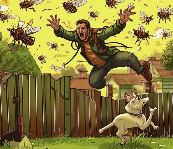 В итоге наш герой, весь искусанный и напуганный, выскакивает через соседскую калитку на улицу, оставляя за собой целую толпу разъярённых насекомых и одного очень недовольного, злющего пса.