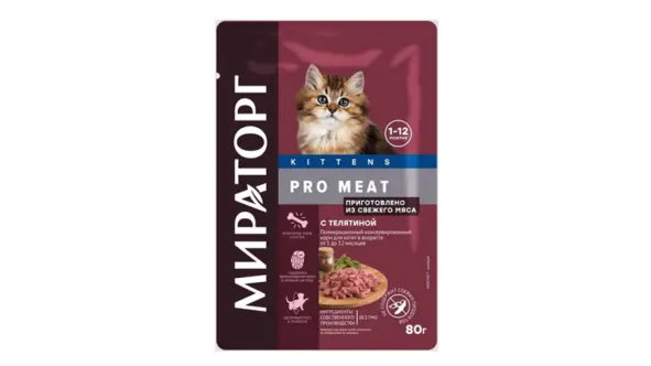 Продолжает список Мираторг Pro Meat. Это влажный консервированный корм, предназначенный для кошек с чувствительным пищеварением, с основным ингредиентом – телятиной. Продукт изготовлен из свежего мяса, что делает его привлекательным для кошек, требующих особенного рациона.