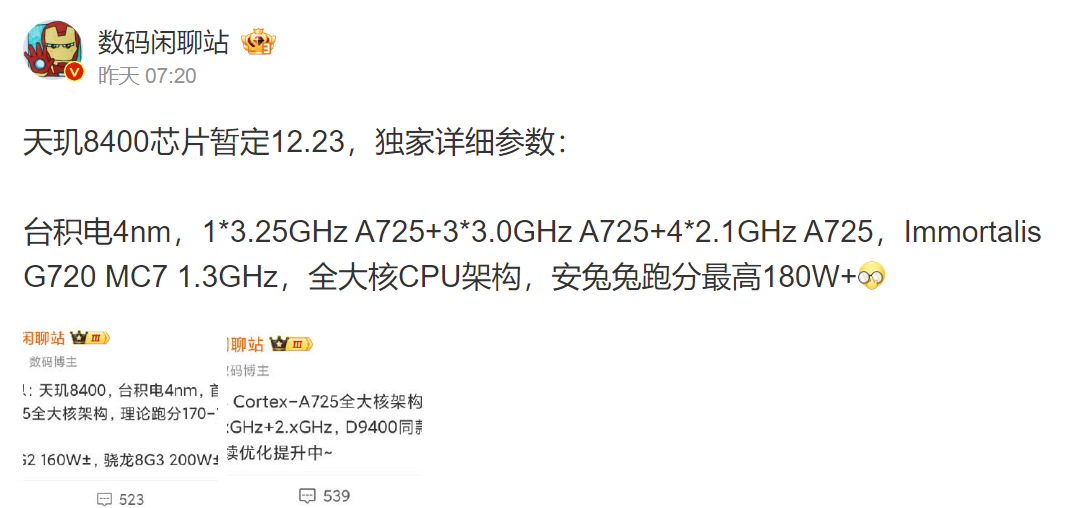Dimensity 8400 получит восемь ядер Cortex-725 и новый GPU Immortalis-G720 MC7