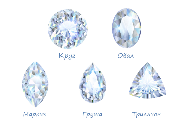 КРУГ. Круглая огранка была разработана в начале XX века, когда появились специальные инструменты для обработки алмазов. Считается, что классической формой для бриллианта является круглая, состоящая из 57 граней, которая позволяет полностью раскрыть красоту и блеск кристалла. Для обработки маленьких образцов можно использовать 33 или 17 граней, однако это приводит к большим потерям материала, так как приходится отсекать до половины исходной массы. ОВАЛ. Овальная огранка стала широко использоваться с середины двадцатого века. Ее вытянутая форма и 57 клиновидных граней придают драгоценному камню красивый блеск. Камни в форме овала идеально подходят для изготовления изящных колец, визуально удлиняя пальцы и добавляя им изящности. МАРКИЗ. Форма огранки "Маркиз" представляет собой овал, с удлиненными и заостренными концами, что может вызывать ассоциации с таинственной улыбкой маркизы де Помпадур или, с более практической точки зрения, с обычной лодочкой. Эта огранка, состоящая из 55 граней,