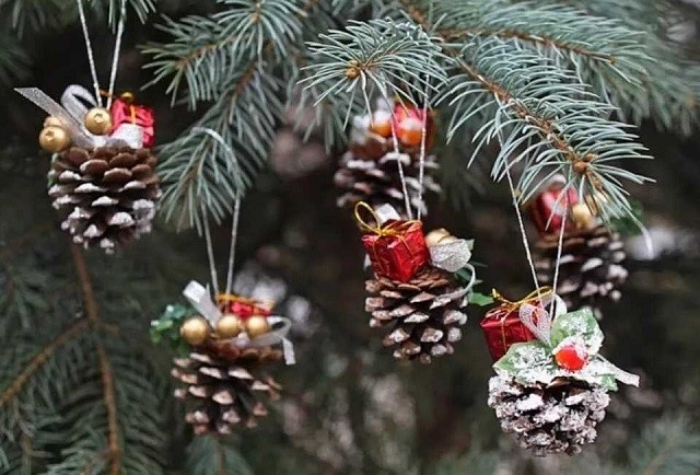 Ну какая елка без шишек? Если вам не удалось купить настоящую новогоднюю красавицу, украсьте искусственную настоящими шишками. Покрасьте их по краям белой краской. Можно сделать это из баллончика. Сверху можно приклеить бантик или другой элемент декора. Также приделываем петлю. Готовы оригинальные елочные игрушки. Можете вешать их на свое елку или отнести в садик/школу, в качестве конкурсанта.