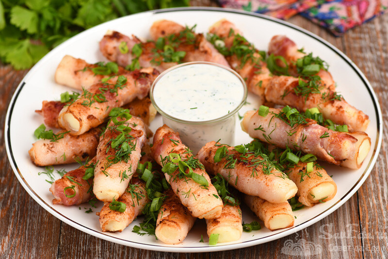 Почему всем рекомендую эти закуски. Во-первых, невероятно просто готовить. Потребуется 2 основных продукта, плюс специи. Заготовки можно сделать заранее и потом быстро их приготовить. Во-вторых, они необычные. Приятно следить за реакцией гостей. Они не могут понять из чего они сделаны, пробуют и удивляются вкусом. В-третьих, это на самом деле вкусно. Подаю их теплыми, но и при остывании они очень вкусные. Готовить их можно на плите, в духовке или на мангале. 1. Зеленый лук в беконе. Недавно открыла для себя этот вкус и была приятно удивлена. Для приготовления берем сырокопченый бекон (150 г). Он соленый и с приятным копченым вкусом. Зеленый лук (100 г) промываем и просушиваем (размер стеблей может быть разный). Большие стебли зеленого лука (у меня их 3 шт.) складываем пополам и начинаем обматывать ломтиками бекона. На 1 заготовку уходит 2 ломтика бекона. Небольшие стебли (у меня их 2 шт.) соединяем, складываем пополам и обматываем. Получаются вот такие заготовки (4 шт.). Концы бекона д
