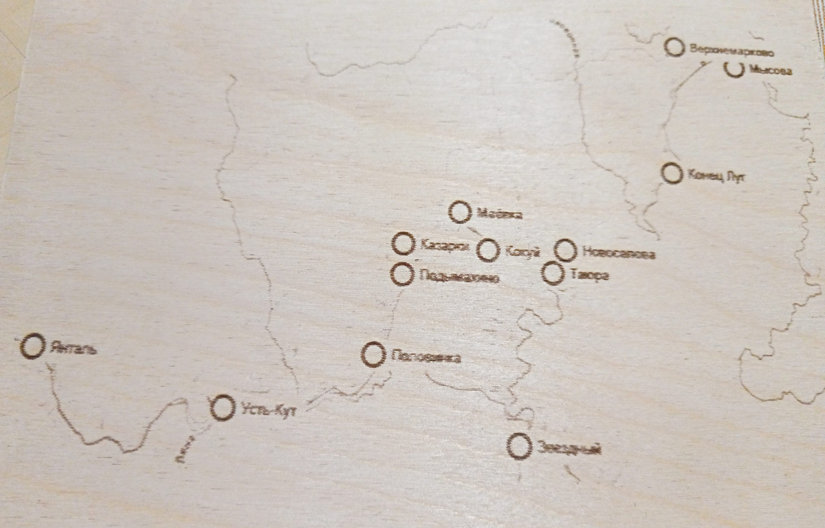 Тут подарили мне на день рождения лазерный станок. Гравер. Штука, конечно, очень интересная. Но нужно приноровиться. Летом буду бирки на помидоры на нем печатать. А вообще задумок очень много. Хочу сделать целую галерею из вокзалов. Есть у нас в доме большая деревянная стена, вот буду на ней размещать. Пока же просто тренируюсь. Вот первый блин, почти комом. Но в целом узнаваемо. Пробую, шрифт какого размера будет читаемым. Сделал карту центра Усть-Кутского района. В целом прочитать можно.