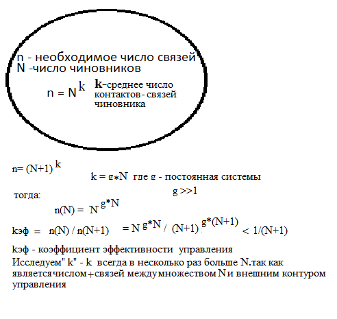 Как видим, каждый лишний чиновник приводит к кратному образованию лишних связей. Если учесть, что связь имеет временное и количественное измерение, т.е., это потеря времени на лишние контакты, лишние ресурсы- бумага и "рамка" взаимодействия, то эффект "избыточности" становится безобразно огромным. (Точно то- что мы наблюдаем и называется БЮРОКРАТИЕЙ. Кстати, цифровизация приводит к сведению всего и вся в одну управляющую матрицу, что приводит к экспоненциальному росту пустой дублирующей информации, что приводит к "съеданию" мнимой полезности цифровизации.. Но, это попутное ,очевидное замечание, это потому что изначально, присутствует презумпция огромных способностей "цифры" ассимилировать ВСЁ.. .. А и она исчерпывается физическими процессами ввода , использования, редактирования и переработки ПО и баз данных. Причем, мощность "цифры" может быть любой.. Она будет исчерпана этим монстром пустоты...