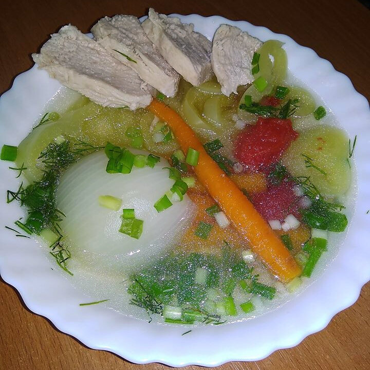 Суп разлить по тарелкам, добавить нарезанное филе и зелень.