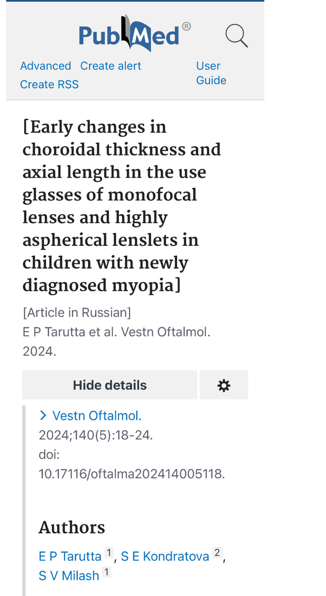 Новая статья, написанная под научным руководством профессора, руководителя отдела патологии рефракции, бинокулярного зрения и офтальмоэргономики НИМЦ им. Гельмгольца, Тарутты Е. П., заинтересовала зарубежных коллег и вошла в первые строчки зарубежных научных офтальмологических рейтингов. Мы впервые сравнили, как влияют на кровоток глаз и биометрические параметры линзы обычные и линзы Stellest у детей с миопией, в качестве первых очков в самые ранние сроки ношения. 29 пациентам с впервые выявленной миопией слабой степени в возрасте в среднем 8-12 лет были впервые назначены монофокальные очки (МФО) (1-я группа) или очки Stellest (HAL) (2-я группа). Всем пациентам помимо стандартных офтальмологических методов исследования были проведены оптическая биометрия и измерение толщины хориоидеи (сосудистой оболочки глаз, ТХ ) с помощью оптической когерентной томографии. РЕЗУЛЬТАТЫ ✅ В 1-й группе (МФО) через 1 месяц толщина сосудистой значимо уменьшилась — на 18,13±7,88 мкм, во 2-й группе (
