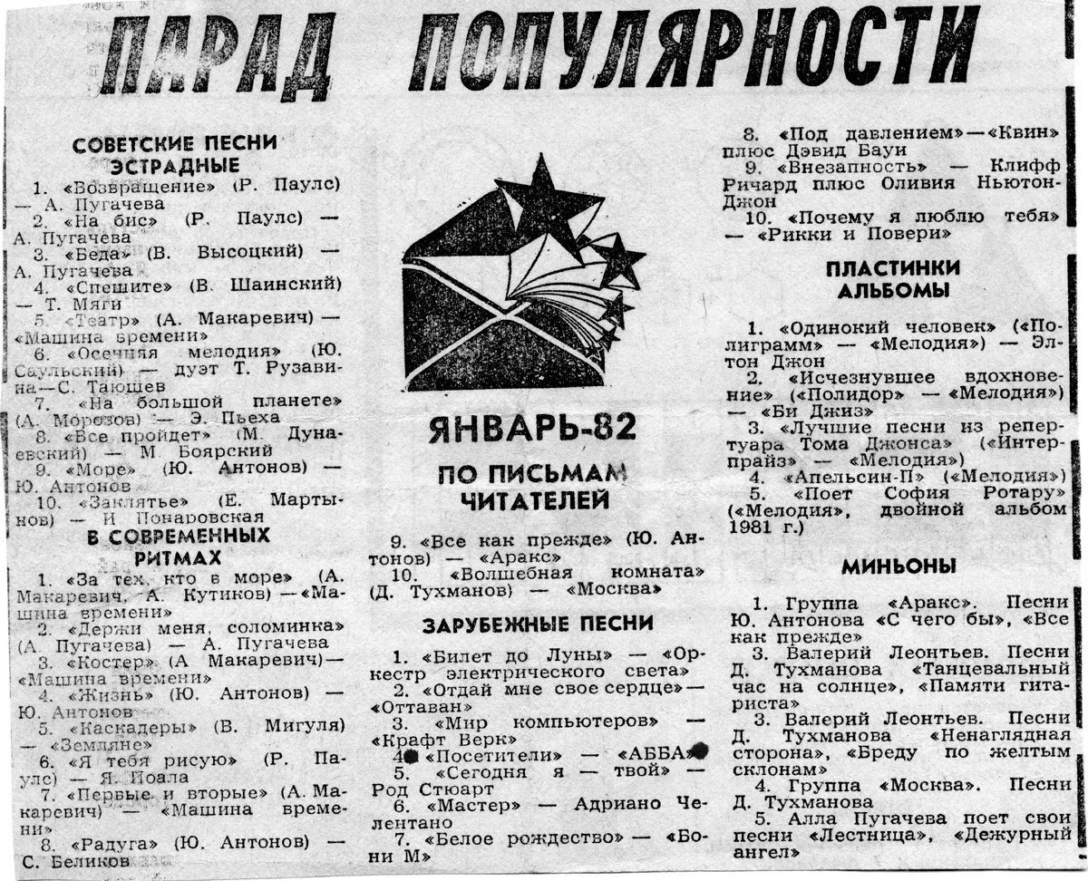 Лучшие песни января 1982 года -парад популярности газеты "Смена"