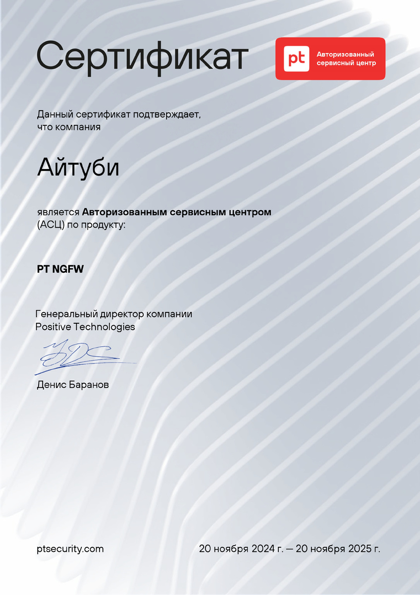 Мы стали одними из первых тщательно отобранных партнеров Positive Technologies, которые прошли подготовку и могут оказывать полную техническую поддержку PT NGFW, предоставляя персонализированные услуги лучшего качества по всей России. Будучи авторизованным сервисным центром , мы гарантируем качество всех услуг по поддержке вендора. Наши специалисты обладают самой высокой экспертизой для работы с NGFW Positive Technologies. В случае критически опасных инцидентов наше время реагирования на них составит от 60 минут до 2 часов, независимо от географии заказчика. 24/7 мы готовы решить любой возникший вопрос, а также проанализировать вашу структуру безопасности и предложить дополнительные сервисы и услуги, исходя их потребностей вашего бизнеса.