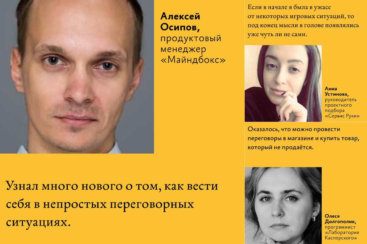 Задача курса — дать профессионалам базовые навыки переговоров и снять страх перед «непоколебимым» клиентом, а менеджерам — научиться отстаивать интересы без разрушительных последствий. На курсе рассматриваются универсальные приёмы устных и письменных переговоров. Подробно разбираются отношения с клиентом от первого обращения и понимания задачи до работы в проекте и профилактики ссоры.