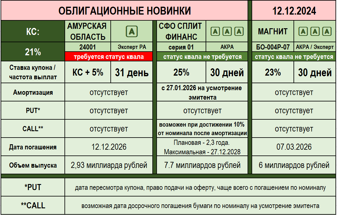 🎉 Утренней бодрости нам с вами, друзья! Ведь она пригодится, чтобы по достоинству оценить новые выпуски, которые сегодня нам предлагают товарищи эмитенты :) ✅ Три выпуска можно будет купить в стакане после обеда: 1️⃣ МАГНИТ БО-004Р-07 (🅰️🅰️🅰️) 🔢 ISIN: $RU000A10AAT8 🔸Купон фиксированный: 23% 🔸Без оферт и досрочного погашения 🔸 Погашение через 1 год и 3 месяца 🔸 Рейтинговый отчет: https://raexpert.ru/releases/2024/jun10c, https://www.acra-ratings.ru/press-releases/4832/ Выпуск для тех, кому не хватило. И в первую очередь это касается эмитента, видимо :) Если решите вписаться, то полезно будет сравнить с бумагой 004Р-05 $RU000A10A9Z1, которая имеет точно такой же купон и примерно такой же срок до пут-оферты. Тут же с офертой морочиться не придется, мини-плюс :) 2️⃣ СФО СПЛИТ ФИНАНС серия 01 (🅰️🅰️🅰️) 🔢 ISIN: $RU000A10AAQ4 🔸Купон фиксированный: 25% 🔸Со второго года торгов амортизация на усмотрение эмитента 🔸СALL возможен при достижении 10% от номинальной стоимости 🔸 Ма