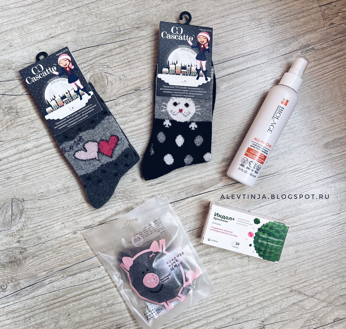 Есть у человека мечта, он её и мечтает - выложить все полученные в этом году посылки до окончания этого самого года. Не уверена, что сбудется, но я буду стараться. И в рамках стараний сегодня покажу вам очередную посылку из Золотого яблока. Итак, заказала - получила: 🍏Носки Cascatto Серый 🍏 Носки Cascatto Черный Не поверите, весь сыр-бор затевался из-за прекрасной цены на носки с прекрасным составом и прекрасным дизайном. Смотрите сами, 135 рублей за носки с шерстью и ангоркой - это просто подарок небес. Я их уже вовсю ношу. Тёёёёплые! 🍏 Мультифункциональный спрей для волос BIOLAGE All-in-one Ой, а это какая кайфовая штука! Спрей для волос для решения множества проблем. Он тебе и волосы распутает, и защитит от горячего воздуха фена, и увлажнит и напитает, и от порчи-сглаза убережет. В самое ближайшее время напишу полноценный отзыв. 🍏 Спонж-конняку c углем для умывания Dr. Lola Freeze Drying Konjac Cleansing Tool Спонжиком конняку я люблю смывать глиняные и прочие