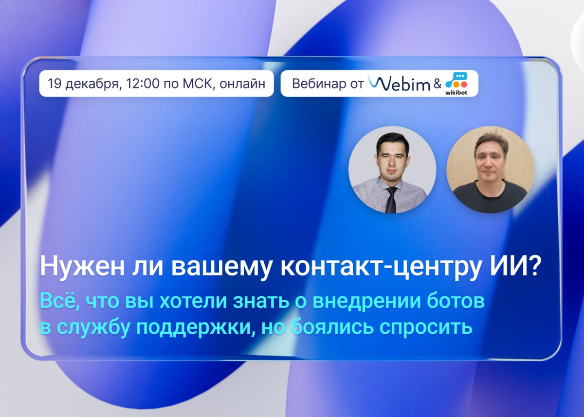 19 декабря в 12:00 по МСК проводим бесплатный вебинар вместе Webim. Всё, что вы хотели знать о внедрении ботов в службу поддержки, но боялись спросить Эксперты из Webim вместе с Wikibot расскажут, как внедрить и обучить бота, который понимает любые формулировки вопросов и отвечает на запросы пользователей в свободной форме. А также обсудят, как рассчитать эффективность внедрения AI-технологий в ваш контакт-центр. В программе вебинара: • Как оценить эффективность внедрения ИИ • Целевая функция бота — что это такое? • Как рассчитать юнит-экономику диалога и отдела поддержки • В каких сценариях ИИ-бот точно не поможет или даже навредит? • Интеграция бота и омниканальной платформы: как работает и что важно знать • Реальные кейсы клиентов. Cсылка для регистрации https://bit.ly/3ZpkGVW