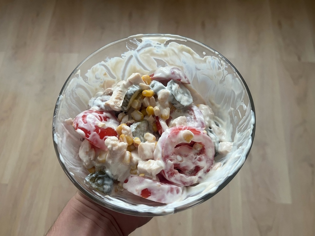 1. ОГУРЦЫ ( я выбираю малосолёные) Я беру малосолёные, так как мне они нравятся больше, вы же можете брать обычные. 2-3 штуки режем и отправляем в тарелку. 2. ПОМИДОРЫ Я добавляю 1-2 помидора, это все тоже по вкусу. 3. КУКУРУЗА 2-3 столовые ложки с горкой 3. КУРИНАЯ ГРУДКА. 100-150г. режем и так же добавляем в тарелку Я использовал копченую куриную грудку, так как она по моему мнению не такая сухая как замороженная, а белка в ней столько же.