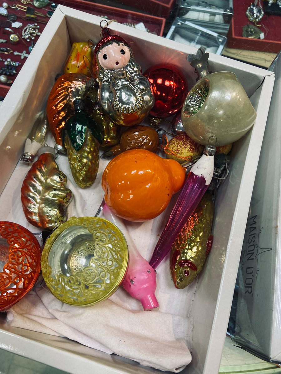 Уже традиционно ищу перед праздниками старые елочные игрушки. Их можно купить на блошиных рынках, разных ярмарках. Винтажные елочные игрушки переносят нас в прошлое, когда их берешь в руки, то сразу вспоминаешь детство, становится тепло и безопасно.