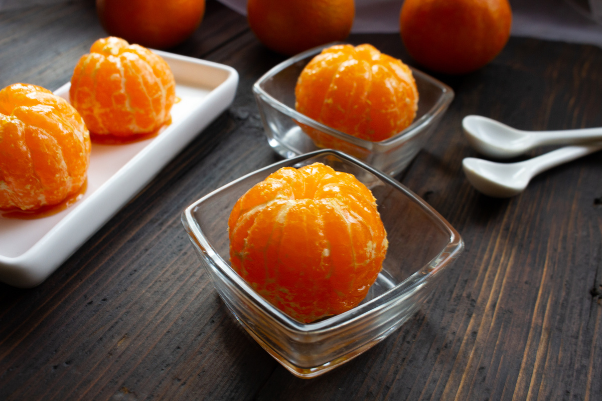 Этот замечательный десерт порадует в зимние праздники, тут гармонично сочетается все: приятная сладость, новогодний цитрусовый аромат, сочность, яркость и легкая веселящая пьяная нотка. Такой десерт готовится быстро, но ему нужно постоять ночь в холодильнике, чтобы мандарины хорошо пропитались сиропом. Если у вас за столом будет детвора, то такой десерт для детей можно приготовить и без добавления алкоголя. Но это конечно больше десерт для взрослых, который хорош для романтического ужина. Вместо коньяка подойдет любой ароматный и вкусный алкоголь.