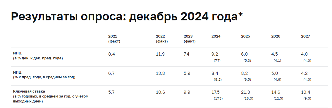 Банк России опубликовал данные последнего в текущем году консенсус-прогноза по российской экономике. Напомню, что он составляется на основе опроса порядка 30 ведущих аналитиков страны, включая официальные ведомства, рейтинговые агентства, банки и даже авторитетные аналитические телеграм-каналы. На этот прогноз можно будет опираться как на базовый, например, сравнивая далее с фактическими результатами, поэтому мы к нему еще не раз вернемся. Ссылку на свой подробный обзор всего прогноза я дам в конце, а сейчас начнем рассматривать его по частям. Первая часть, которая в наибольшей степени затрагивает интересы всех без исключения россиян - это ожидания по инфляции и, как следствие, по ключевой ставке ЦБ. В сравнении с данными предыдущего прогноза (октябрь 2024), аналитики существенно повысили свои ожидания по инфляции как на текущий, так и на следующие годы (в скобках представлены предыдущие значения). Так, прогноз по значению инфляции на конец текущего года вырос аж на 1,5 процентных пунк