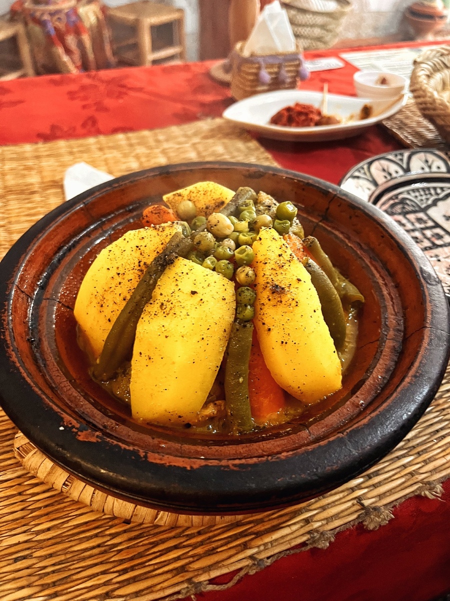Знакомство с кухней Магриба обязано начаться с этой странной посудины. Тажинами здесь называют замысловатый горшок, в котором готовят, и одновременно само блюдо, что рождается под крышкой. Результат всегда максимально вкусный и особенно понятный человеку, выросшему на русской кухне. Самая популярная в Марокко традиционная посуда для готовки имеет более чем тысячелетнюю историю, а то и древнее. Но менее востребованной за века она не стала – глиняными тажинами здесь торгуют на каждом рыночном углу и в магазинах, хозяйки и рестораторы закупали их килограммами. Формула успеха проста: берём плоское основание с низкими бортиками и накрываем его большой крышкой форме конуса или купола. Предварительно в центр накладываем имеющиеся в хозяйстве овощи и любое мясо. Чаще всего в ход идут картофель, морковь, баклажаны, оливки, стручковая фасоль, лимон, из мяса – курица или фарш. Ну и специи по вкусу. Вот такой вольный рецепт. Традиционно блюдо ставят на раскалённые угли, но сегодня у местных ес