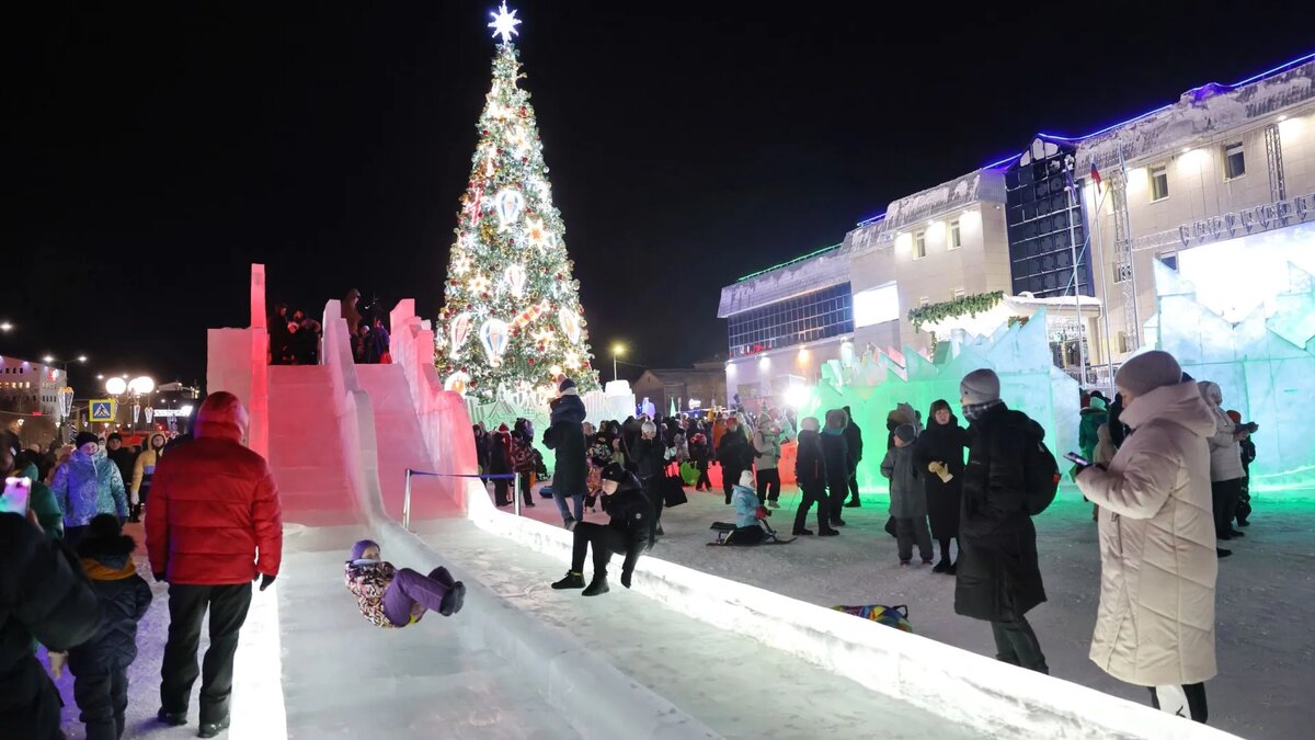 Две самых больших горки находятся по бокам от елки. Фото: Андрей Ткачёв / «Ямал-Медиа»