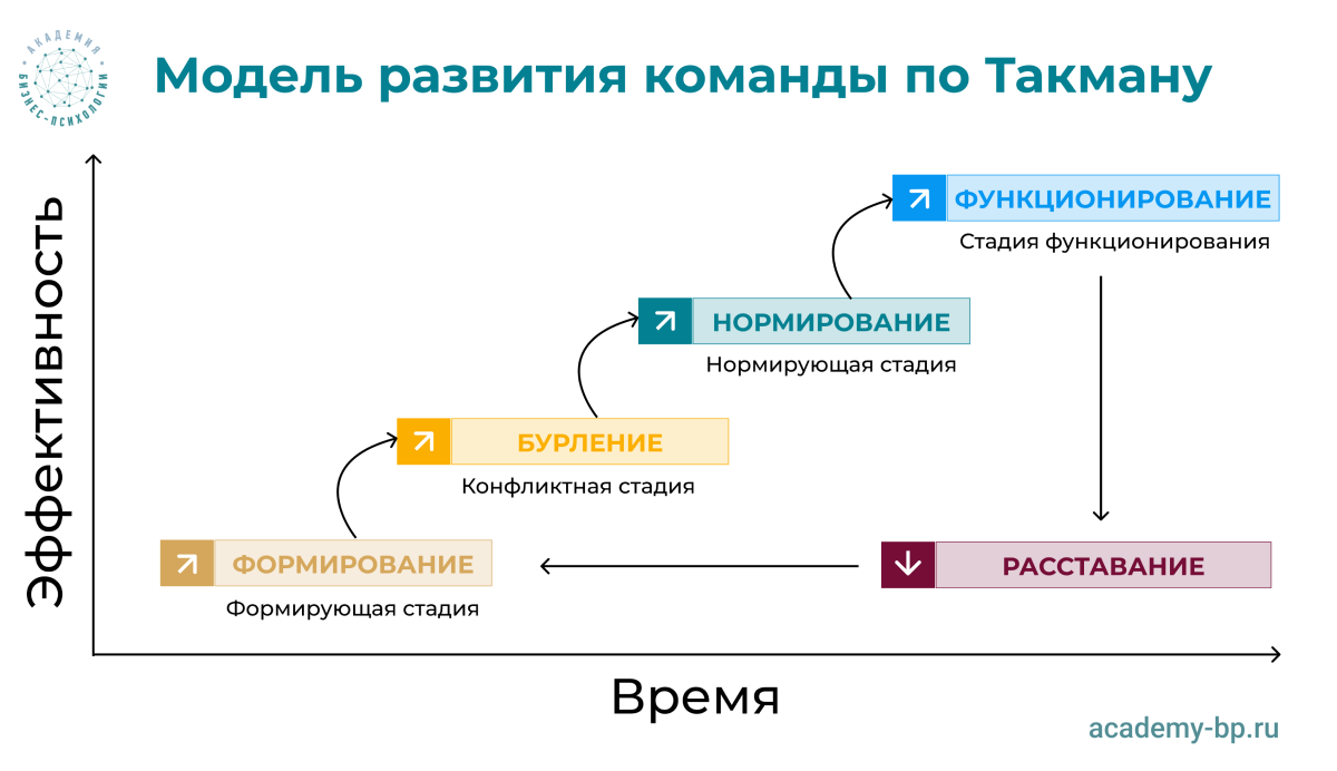 Работая с командами, мы часто сталкиваемся с ситуациями, когда разногласия между сотрудниками воспринимаются как что-то негативное. Многие руководители стремятся любой ценой избежать конфликтов. Но так ли это правильно? На самом деле конфликты — естественная и даже необходимая часть развития любой команды. Это хорошо объясняет модель 5 стадий развития команды, разработанная Брюсом Такманом. Согласно этой модели, команда проходит через следующие этапы: 1. Формирование (Forming) — участники знакомятся, обычно осторожны в общении и стараются избегать разногласий, конфликты маловероятны. 2. Бурление (Storming) — ключевая стадия для возникновения разногласий. Члены команды отстаивают свои позиции, борются за влияние, определяют цели, распределяют задачи и выбирают методы работы. Этот процесс крайне важен для формирования сплоченной команды и выработки общих норм взаимодействия. Именно здесь закладывается фундамент будущей эффективной работы. 3. Нормирование (Norming) — выработка общих прави