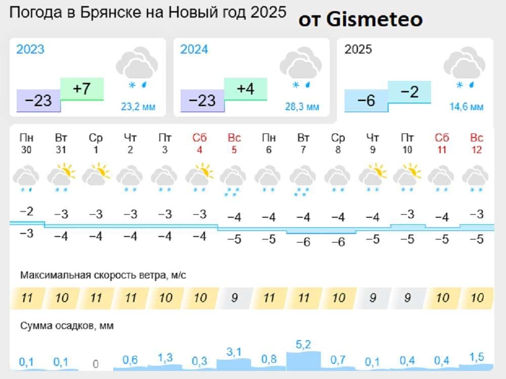 Уф, наконец-то жители и гости Брянской области узнали, к каким сюрпризам погоды – приятным и не очень – стоит готовиться на грядущий Новый год. О том, какими могут быть в плане погоды новогодняя ночь и первый день 2025 года, рассказали сегодня, 12 декабря, синоптики специализированного интернет-портала “Гисметео.” Итак, в ночь с 31 декабря на 1 января ожидается облачная погода, может пройти небольшой снег. Столбики термометров наверняка покажут температуру воздуха до -6 градусов. Хорошо, если не будет слякоти и бесснежной грязи, к коим мы уже успели привыкнуть, увы, за несколько последних новогодних ночей – “гнилых”, некрасивых и совсем не волшебных. Днем 1 января “потеплеет” до минус 3-4 градусов. Пасмурная облачность сохранится. Первый день 2025 года, есть такая вероятность, пройдет без осадков. Стоит помнить, что любой долгосрочный прогноз погоды весьма приблизительный. И все еще может поменяться десять раз. Но что мешает нам надеяться на слегка морозную ночь со снегом? Ничего, прав