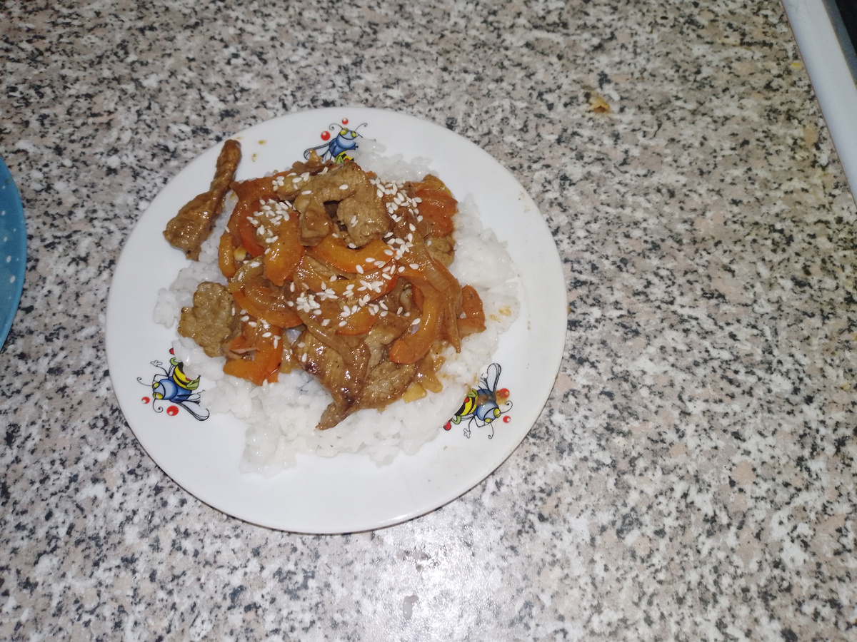 Всем привет. Сегодня решила с вами поделится рецептом мяса по-азиатски. Итак, нам понадобится: 400гр. говядины Соев. соус-3ст. л Крахмал-1ст. л Перец болгарск. -150гр. Лук репч. 100гр Соль, перец 1 желток Чеснок. Раст. масло, кунжут. петрушка, перец Чили. Слегка замороженную говядину(у меня телятину) нарезать тонкими пластами. Добавляем соль, перец, крахмал, желток, соевый соус. Хорошо перемешиваем и маринуем1 час Обжарить на хорошо разогретой сковородке 10-15 мин. До красивой корочки. Убираем мясо и на этой же сковороде обжариваем перец и лук около 3 мин. Добавляем мясо. Добавляем перец Чили, чеснок по желанию кунжутное масло и хорошо обжариваем. Просыпаемся зеленью и пробуем. Приятного аппетита!!!