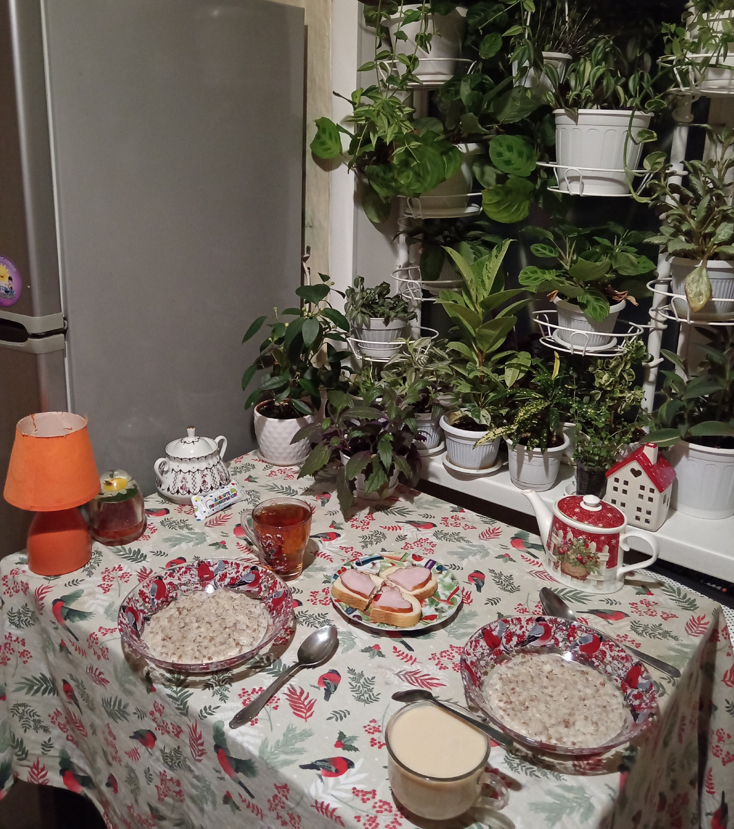 На завтрак молочная гречневая каша без сливочного масла. Ребенку приготовила небольшие бутерброды с ветчиной. Чай сделала покрепче. Себе с молоком.