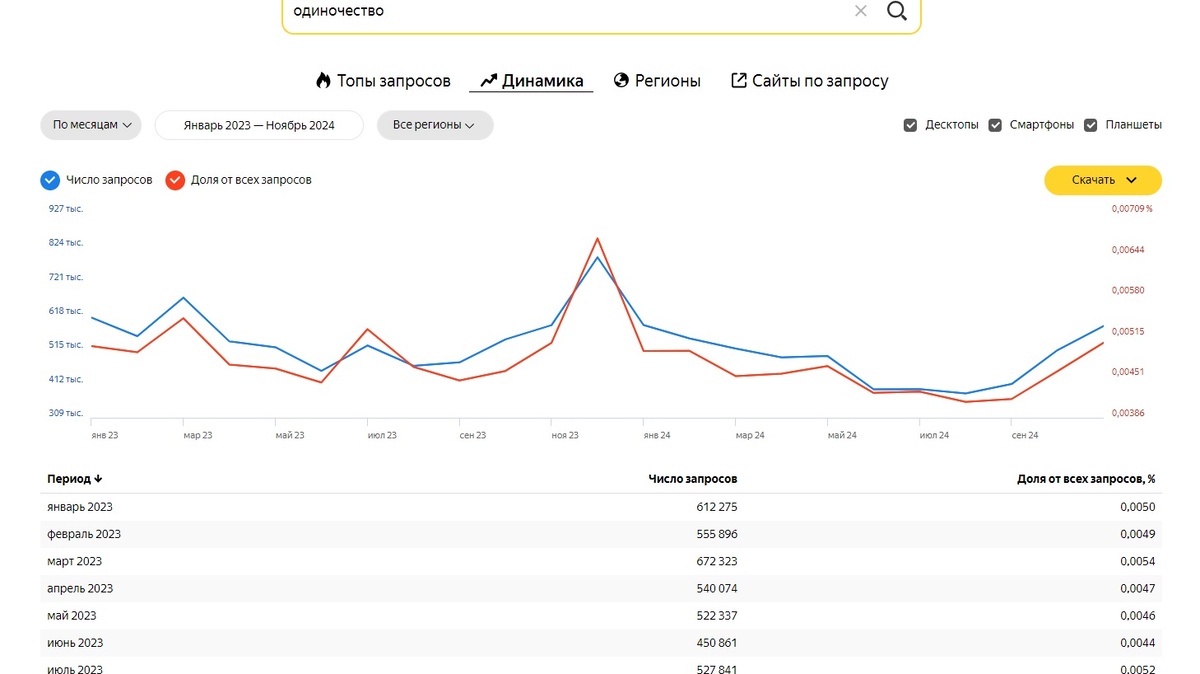 Начинаю цикл Новогодних статей с такой темы, как Одиночество. Новый год — время, когда многие из нас мечтают о тепле и уюте в кругу семьи или друзей. Однако для тех, кто встречает этот праздник в одиночестве, он может стать источником грусти и изоляции. В этой статье мы рассмотрим, как справиться с новогодним одиночеством и сделать этот период особенным. Новогоднее одиночество часто связано с ощущением, что ты не вписываешься в общепринятые нормы празднования. Это может усиливать чувство неполноценности и изоляции. Важно помнить, что многие люди оказываются в такой же ситуации, и это довольно распространенное явление. Если мы посмотрим количество запросов со словом одиночество в Яндекс Вордстат с Января 2023 по Ноябрь 2024, то увидим, что пик данных запросов пришелся на Декабрь 2023 года. Новогоднее одиночество — это не приговор, а возможность для саморазвития и самопознания. Применяя эти советы, вы сможете сделать этот период особенным и менее болезненным. Помните, одиночество - это
