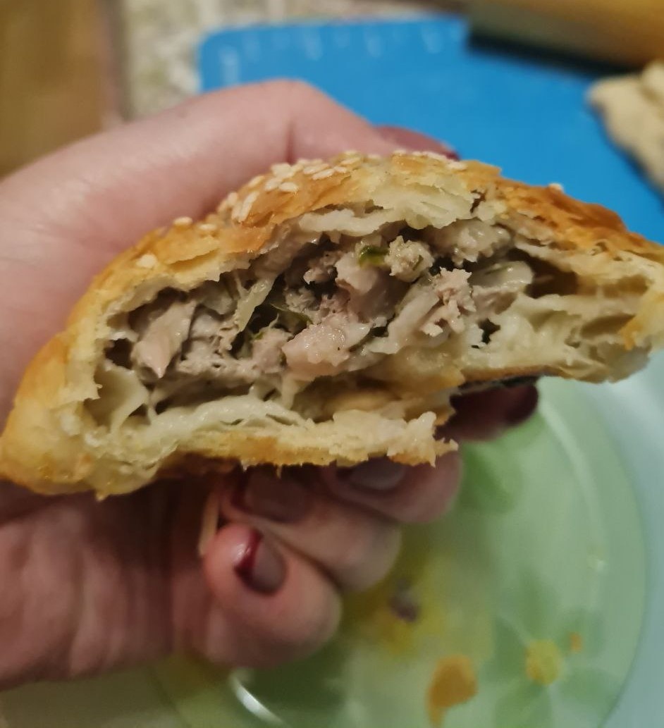 Смешиваем в миске яйцо, воду, соль и сахар. Добавляем муку. Замешиваем тесто и оставляем его на часик отдохнуть. В это время режем лук кубиком, зелень мелко рубим. Лук и зелень добавляем в фарш, туде же добавляем соль, перец, иные специи по вкусу. Все тщательно перемешиваем. Делим тесто на 4 части, каждую часть раскатываем в большой лист, смазываем каждый лист маслом и укладываем листы друг на друга. Скатываем наши листы в рулет, делим его на 12 частей. Каждую часть приминаем в середину. Из каждой части раскатываем лепешку, укладываем на нее столовую ложку фарша и складываем в треугольник. Укладываем полученные треугольники на противень, смазываем взбитым яйцом, посыпаем кунжутным семенем. Запекаем в духов