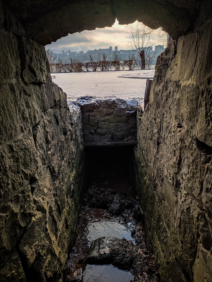 Одной из немногих сохранившихся на текущий момент примеров гидротехнических сооружений бытового назначения дореволюционного периода во Владивостоке является небольшая ливневая система практически в самом центре города наряду с другой не менее интересной системой коллекторов, о которой я писал в этой статье: Такой вид открывается на улицу у выходного портала ливневого коллектора. Коллектор узкий и довольно низкий, на всей протяженности приходится склонять голову. В самом начале коллектора (здесь еще можно стоять в полный рост) под острым углом в сторону под потолочным сводом уходит очень низкий тоннель. Вскоре он оканчивается решеткой в месте слияния с подвалом одного из зданий на противоположной стороне улицы. Потолочные своды здесь, как и непосредственно у входа в коллектор бетонные и относятся к более позднему периоду чем сам коллектор. Вероятно в последствии (в советское время) при развитии сети ливневой канализации для отвода ливневых вод от нового здания к коллектору пристроили