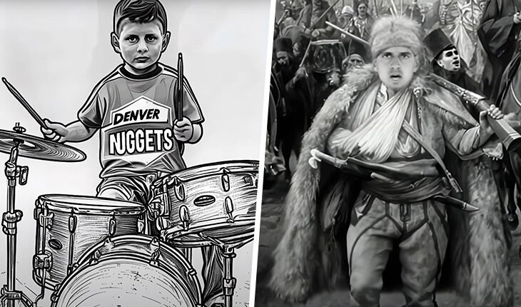 Первый же кадр с маленьким Йокичем, играющим на барабанах, отсылает сразу в два адреса. Во-первых, к знаменитому фото, на котором совсем маленький Йокич стоит в толстовке с символикой своего будущего клуба «Денвер Наггетс». Фото немедленно завирусилось, а запросы на покупку мерча стали настоль частыми, что у фирмы Mitchell & Ness, обладающей правами на выпуск продукции с ретро-символикой клубов НБА, просто не осталось выбора. Пришлось специально выпускать партию свитшотов.