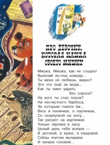 Девочка играет с плюшевым мишкой - шьёт ему одежду, кормит, гуляет с ним по двору. Эти простые стихи легко запоминаются и остаются на всю жизнь связанными с детством, как и эти яркие иллюстрации, и этот трогательный мишка - любимая игрушка многих поколений детей.