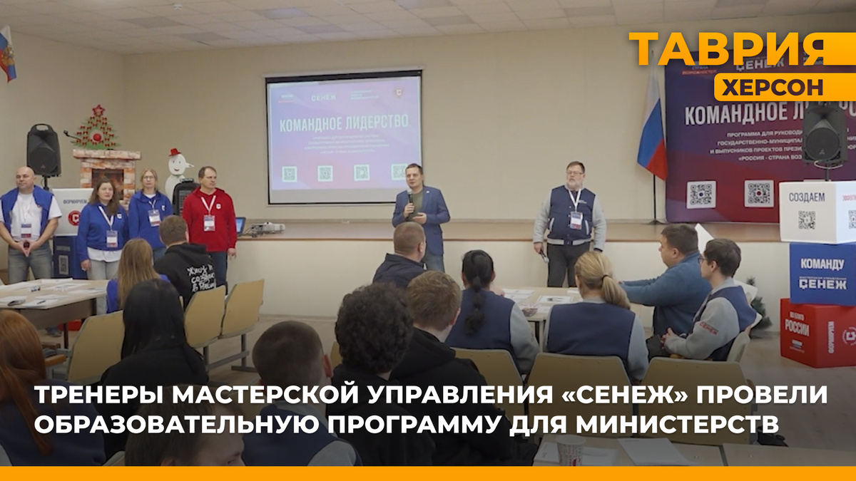 Тренеры мастерской управления «Сенеж» провели образовательную программу для работников министерств молодёжной политики, спорта, образования и науки, а также министерства культуры Херсонской области. Каждому участнику образовательной программы была подарена книга, которую написал эксперт по развитию команд, powerbank и брендированный бомбер. «Пришли сюда для того, чтоб понять механику и методику взаимодействия в команде. Примерить на себя эти роли. Благодаря которым они могут эффективно решать задачи и реализовывать проекты связанные с развитием России, — отметила руководитель проектов по партнерскому и сетевому взаимодействию мастерской управления «Сенеж». В течение 8 часов 50 человек выполняли практические задания двух тренеров. Они использовали современные методики и помогали управленцам Новороссии понять свою роль в проекте, научили их грамотно руководить личными и командными процессами. На живом примере показали, как эффективно использовать полученные знания. В каждой группе участн