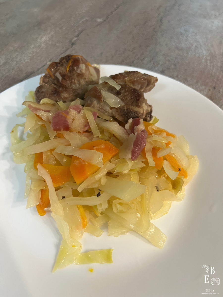 Ингредиенты: Способ приготовления: 1. Режем морковь полукружочками 2. Лук режем мелко, кубиками 3. Бекон режем крупными кусочками 4. Лук, бекон, морковь обжариваем на растительном масле. Солить не нужно. 5. Добавляем квашеную капусту. Обжариваем. 6. Шинкуем свежую капусту и добавляем ее в сковороду, где морковь. Перемешиваем. Тушим 7. Пока тушится капуста, на отдельной сковороде обжариваем ребрышки/свинину на косточках Жарим до красивой корочки 8. Добавляем ребрышки/свинину на косточках к капусте. Оставшимся соком от свинины можете полить капусту, она пропитается вкусным мясным соком. Перемешиваем. Пробуем: теперь мы понимаем сколько кислинки и соли отдала квашеная капуста, и только теперь солим. Для готовки всегда использую крупную соль (с солью мелкого помола очень легко переборщить). 9. За несколько минут до готовности добавляем крупно порезанный чернослив (2-3 штуки). Перемешиваем. 10. Когда капуста потушится и будет готова, блюдо готово. Посмотрите какой красивый золотистый оттен