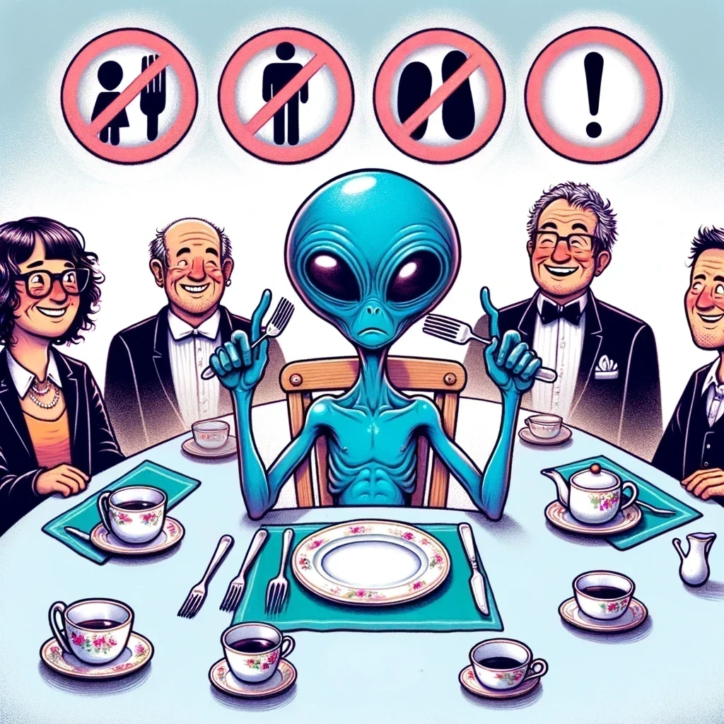 На Земле 🌍 существует множество невидимых правил, которые называются «этикет». Эти правила обитатели планеты используют, чтобы общаться, решать конфликты и придавать своим действиям некий «цивилизованный» вид. Что интересно, эти ритуалы часто не имеют логического обоснования, но всё равно строго соблюдаются. Этикет — это набор правил, которые вроде бы придуманы для удобства, но на самом деле просто делают жизнь немного сложнее. Например, почему нельзя оставлять ложку в чашке, после того, как размешал сахар? 🍵 Или почему вилка должна лежать с левой стороны тарелки, если её всё равно берёшь правой рукой? 🤷♀️ Совет: Если сомневаетесь, просто следите за окружающими и копируйте их поведение. Если это не сработает — улыбайтесь. Улыбка на Земле прощает почти всё. 😊 1. Очереди: культ терпения и стояния 🕒 На Земле стояние в очереди — это как молчаливый договор о мире. Вы стоите и ждёте, пока не наступит ваш черёд. Люди стоят в очередях ради всего: еды 🍔, билетов в кино 🎬, чтобы зайти в