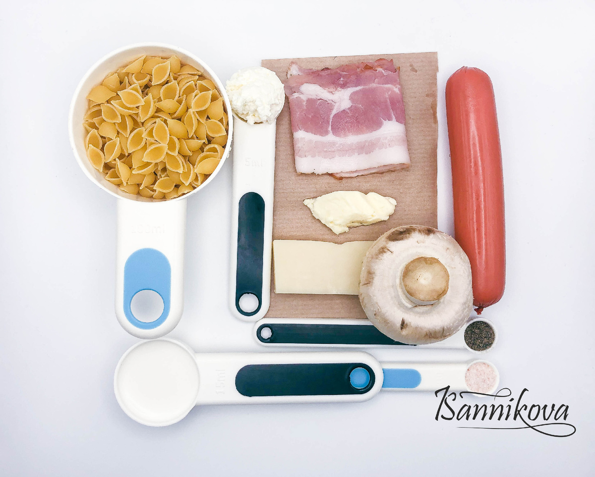 Ссылка на рецепт: https://ksenia-sannikova.ru/paste/recipe400/ Ингредиенты: 1. пасту отварить заранее, с шампиньонов снять кожуру, нарезать дольками, сосиски кружками, бекон средним кубиком, сыр натереть на мелкой терке 2. на разогретой сковороде обжарить бекон и сосиски до золотистого цвета 3. затем добавить шампиньоны, жарить 2 минуты (до готовности) 4. отварную пасту добавить в сковороду, добавить сливки, соль, черный перец, сливочное масло, твердый и творожный сыр, все перемешать в течении одной минуты 5. пасту сразу подаем к столу, можно посыпать сыром