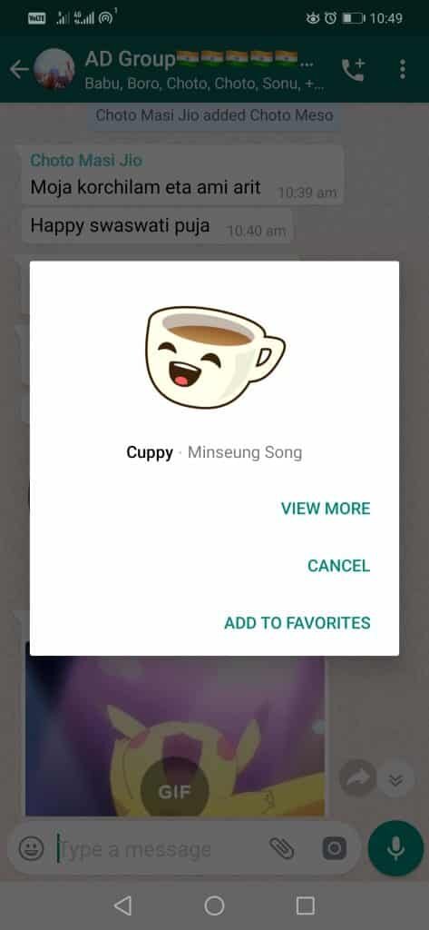 WhatsApp — это отличное приложение для обмена мгновенными сообщениями, которое поддерживает множество элементов, повышающих увлекательность общения. Да, я говорю об эмодзи, гифках и стикерах. В то время как доступ к эмодзи и GIF-изображениям можно получить через встроенное приложение клавиатуры вашего телефона, как насчёт стикеров? Чтобы получить стикеры, вам нужно либо скачать набор стикеров WhatsApp, либо сохранить те, что прислали другие пользователи. WhatsApp позволяет сохранять стикеры, отправленные другими пользователями в чате. Для этого нужно выполнить несколько простых шагов. Вот как это сделать. 1. Задача проста и понятна: когда вы получаете стикер WhatsApp в любом разговоре, вам нужно нажать на нужное изображение. 2. После выполнения описанных выше действий (на смартфонах Android и устройствах iPhone) на экране автоматически появится небольшое контекстное меню. 3. В этом меню вы увидите опции «Подробнее», «Отмена» и «Добавить в избранное». 4. Если вы нажмёте на опцию «Добави