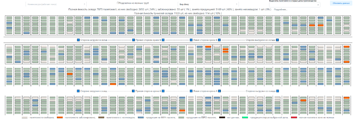 Визуализация автоматического склада готовой продукции Фото 1: Главный экран, вид склада сбоку (смотрим со стороны крана вглубь ячейки). Цветом выделены ячейки в которых расположены паллеты типа Евро или ФИН, а так же заблокированные ячейки Фото 2: Вид склада сбоку. Подсветка не полных ячеек фиолетовым цветом, при наведении курсора мышки появляется всплывающее окно с полной информацией по ячейке. Фото 3: Вид склада сбоку. Подсветка ячеек с определенной номенклатурой, при наведении курсора мышки появляется всплывающее окно с полной информацией по ячейке. Фото 4: Вид склада сбоку. Подсветка ячеек с номенклатурой старше определенной даты. Фото 5-7: Вид склада сверху. Визуальное отображение количества палетомест в ячейке. Цветом выделены палетоместа типа Евро или ФИН, заблокированные, свободные и т.д. Фото 8: Вид склада сверху или сбоку. Отображение статистики по складу в реальном времени общая или подробная по каждому этажу (при наведении курсора) Реализовано на языке Python, фреймворк для