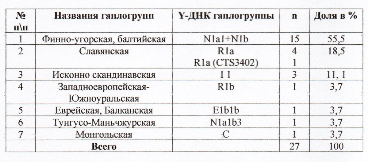 В таблице №1 представлены результаты исследований по определению Y-ДНК гаплогрупп у 27 неродственных между собой мужчин чувашской национальности. Установлено 7 типов гаплогрупп. У автора была установлена балтийская Y-ДНК N1c, в настоящее время она отнесена к гаплогруппе N1a1. Из таблицы видно, что чуваши представляют собой полиэтнический народ, где угро-финны составляют 55,5%, славяне 18,5%, скандинавы 11,1%, западноевропейцы (п 4), евреи (п.5), маньчжуры (п.6) (или тунгусы или эвены или эвенки) и монголы (п. 7) по 3,7 %. В течение тысячелетий или нескольких столетий носители славянских, скандинавских и других гаплогрупп были ассимилированы предками местных угро-финнов и, возможно, предками других исчезнувших племен. Некоторые авторы считают, что чуваши-носители славянской гаплогруппы R1a с субкладами Z280-282 были рабами Волжской Булгарии. «Русь имеет царя, который называется Хакан-русь. Они производят набеги на славян. Подъезжают к ним на кораблях, выходят на берег и полнят народ, который отправляют потом к хазарам и к болгарам и продают там!». (Известия о Славянах и Русах Абу Али Ахмеда Бен Омара «Рукопись Британского музея. Издатель Петербургский Университет, профессор Д. А. Хвольсон, 08.02.1774 г.).