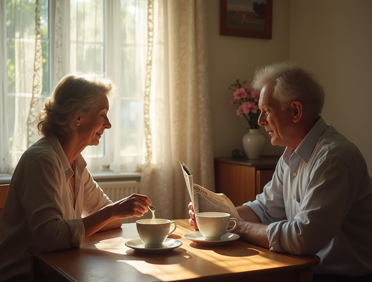 Солнечные лучи просачивались сквозь тюлевые занавески, играя бликами на фарфоровых чашках. Ольга неторопливо помешивала ложечкой кофе, наблюдая, как по поверхности расходятся круги. Виктор сидел напротив, уткнувшись в утреннюю газету, но его взгляд то и дело возвращался к жене, замечая её задумчивую улыбку.