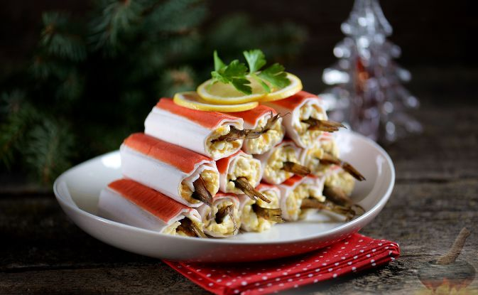 Шпроты в крабовых палочках - очень интересная закуска для праздничного новогоднего меню. Подготовьте ингредиенты для шпрот в крабовых палочках. Яйца отварите 8 минут после закипания, остудите в холодной воде, очистите от скорлупы. Крабовые палочки хорошего качества и проверенного производителя разморозьте естественным способом, размотайте их по шву. Плавленный сыр натрите на крупной терке. Следом натрите отварные яйца на крупной терке. В глубокой миске смешайте сыр, яйца, майонез, посолите и поперчите начинку. Если любите, добавьте пропущенный через пресс чеснок - так закуска из крабовых палочек получится еще вкуснее. На плоской поверхности разложите крабовую палочку, выложите на нее тонким слоем приготовленную ранее начинку из сыра с яйцами и майонезом, выложите на начинку шпроту. Сверните крабовую палочку с начинкой и шпротой в рулетик. Также поступите с оставшимися ингредиентами. Готовую закуску из шпрот в крабовых палочках накройте пищевой пленкой и поставьте на несколько ча