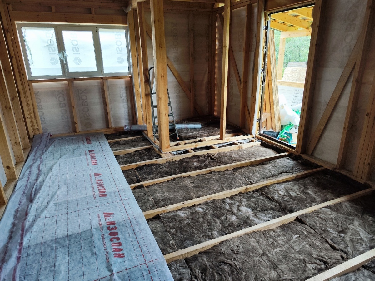 Вся стройка была разделена на две части: за лето я успел завести дом под крышу и обшить стены снаружи, что-бы дождь и снег не попал внутрь. Вторая часть заключалась во внутренней отделки - об этом и будет в этой статье. Самое первое, что нужно было сделать - это собрать черновой пол, что-бы можно было ходить, ставить лестницу, пилить и хранить материал. Начал с утепления минеральной ватой толщиной 100мм в один слой. Порог пола выглядит следующим образом: снизу под лагами находится обрешетка, сетка от грызунов, гидроветрозащита, между лагами утеплитель, сверху утеплителя на лаги постелена пароизоляция с клеящий двойной лентой, обрешетка из доски 25*100мм с шагом 25см, ОСБ 15мм. Вот и пирог пола готов. Следующий этап это утепление стен и мансарды, который пожалуй самый пыльный и сложный в плане работы в полнолицевой маске респираторе при жаре+30, но за-то не дышишь пылью от утеплителя. Утепление стен выполнил минеральной ватой в виде плит толщиной 100мм. После утепления, сделал пароизоля