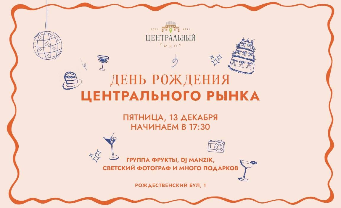 Не знаете, куда сходить в эту пятницу? Где вкусно поесть и весело провести время? 13 декабря «Центральный рынок» отмечает свой 7й День Рождения шумно и ярко! Отличный повод вновь прийти в гости. Вас ждёт уникальная и насыщенная программа: яркий диджей-сет от Manzik и живая музыка в исполнении легендарной кавер-группы FRUKTЫ, которая исполнит любимые хиты от «Ленинграда» до Imagine Dragons. Помимо танцев и веселья вас ждут приятные скидки 7% от семи корнеров: на авторскую шаурму от Chill’n’Grill, темпераментную кавказскую кухню от Tusa Kavkaz, нежнейшие бельгийские вафли от Inchoco, на натуральный какао-бар от Chocolateria и сочные бургеры от From. Остаться голодным просто не возможно! Из славных бонусов и без того приятного вечера - множество призов от партнёров и корнера «Центрального рынка». Ловить пямятные кадры в этот будет светский фотограф – Наташа Польская. Будьте готовы стать новой моделью в объективе, ведь она работала с большим количеством глянцевых изданий: Tatler, Vogu