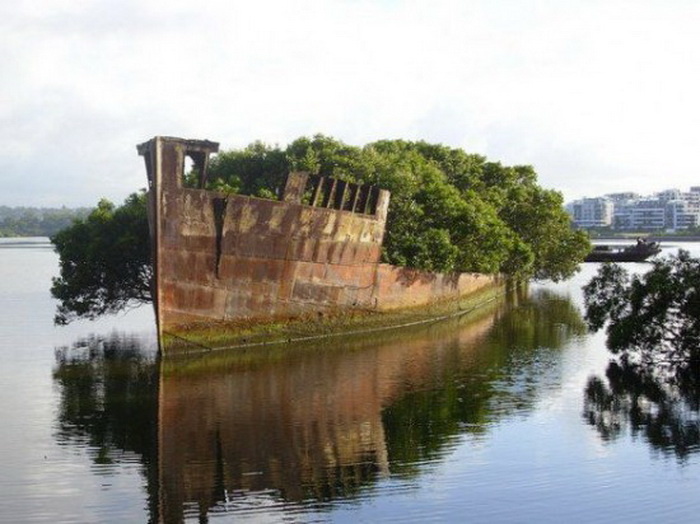С годами природа забрала своё. Корни мангровых деревьев проникли в трюм, превратив заброшенный корабль в плавучий лес. Теперь этот корабль стал уникальной достопримечательностью: металлический каркас корабля покрыт густой зеленью, создавая магическую атмосферу.