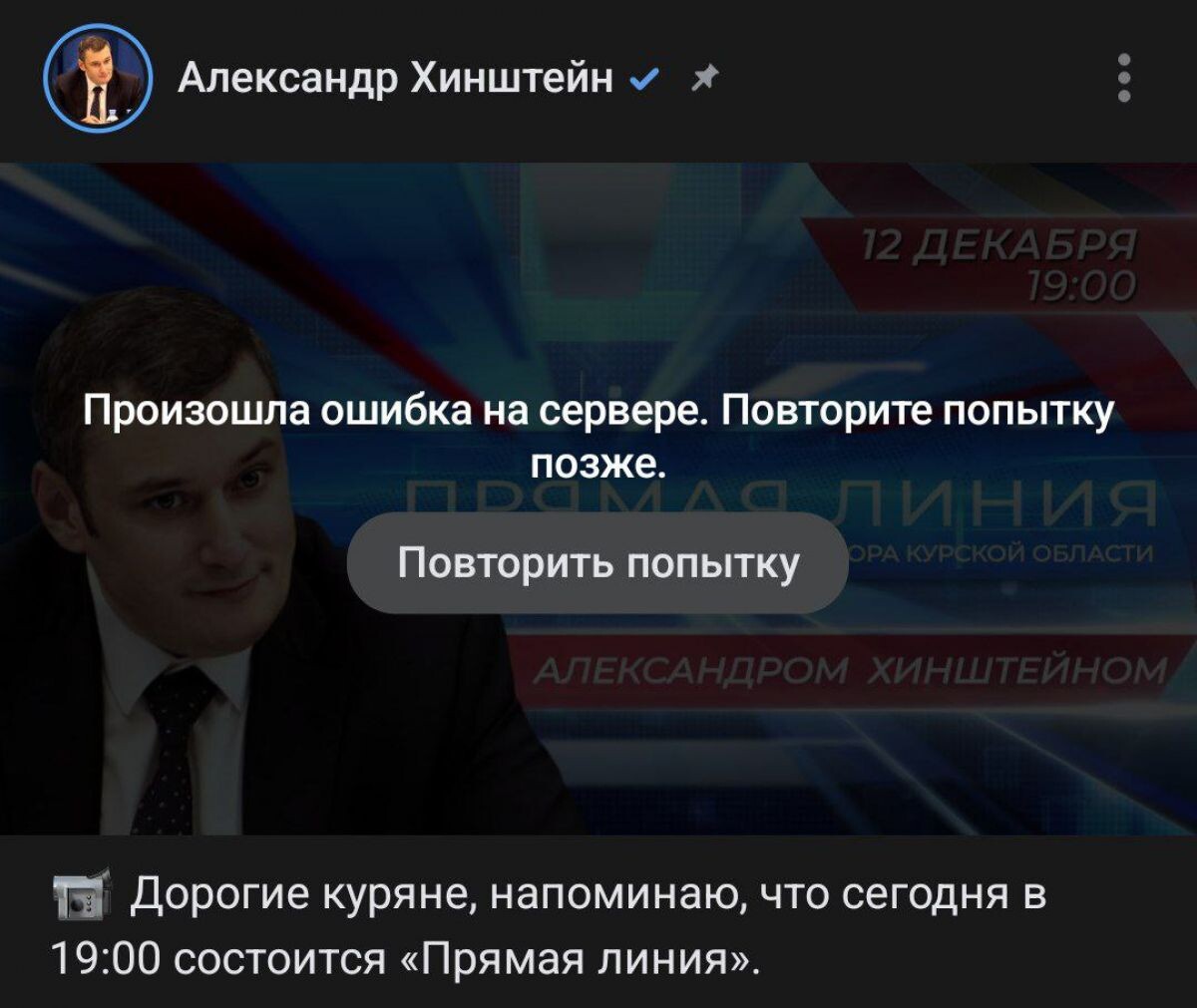 Сегодня проходит прямой эфир врио губернатора Курской области Александра Хинштейна с курянами. Онлайн-трансляцию смотрели более 8 тысяч человек, но сейчас она недоступна. Как сообщает ТРК "Сейм" с отсылкой на ЦУР, наблюдаются технические проблемы, прямую линию атакуют хакеры. Работает техггруппа. xTRANSLATE with