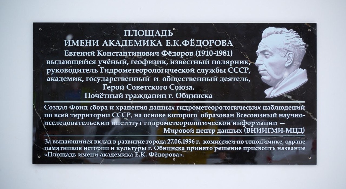 К 60-летию ВНИИГМИМЦД. В Обнинске торжественно открыли памятную доску имени академика АН СССР, Героя Советского Союза Евгения Константиновича Федорова Церемония, приуроченная к 60летию со дня образования Всероссийского научноисследовательского института гидрометеорологической информации – Мирового центра данных, прошла на ул. Королева, 6 здание ВНИИГМИМЦД. – Человек был легенда, и город Обнинск гордится такими именами. Я уверен, что 60-летие Института – это тоже продолжение его деятельности. Спасибо вам огромное! – руководитель администрации города Вячеслав Лежнин выразил слова благодарности сотрудникам ВНИИГМИМЦД. Выдающийся ученыйгеофизик Евгений Федоров 20 лет возглавлял Гидрометслужбу СССР, был участником экспедиции «Северный полюс1», основал в нашем городе три научных института ВНИИГМИ – МЦД, ВНИИСХМ и Тайфун. Под его руководством построили высотную метеорологическую мачту, которая в народе получила название «Федоровская вышка». За свои заслуги ученый был удостоен звания Героя Сов