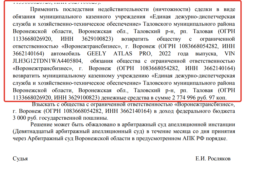 Во исполнении решения Арбитражного суда покупатель машины, муниципальное казенное учреждение «Единая дежурно-диспетчерская служба и хозяйственно-техническое обеспечения Таловского района», вернул транспортное средство продавцу – ООО «ВТБ», а тот в ноябре 2023 года отдал 2 млн 774 тыс рублей, то есть полную стоимость год назад проданного автомобиля.
